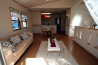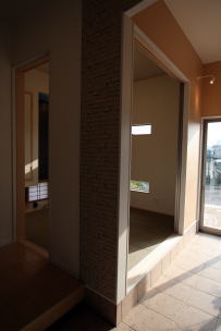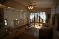 「アムール砂」 お家の顔となる玄関は2階に通じる壮大な吹き抜け。 2階のリビングは、バルコニーへと繋がって広々とした開放感。 全開口サッシからはたくさんの光と気持ちい風をリビングに届けてくれます。 |
