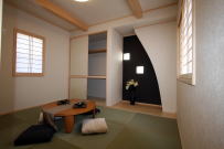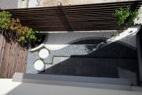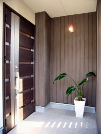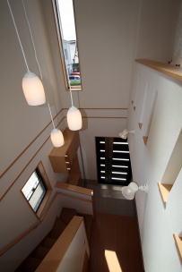 「アムール金岡」 全体的に明るい建材の中に、玄関ドアやカーテン、吹き抜けの梁をモノトーンにする事で空間のアクセントに。坪庭や吹き抜け、タイルカウンターなどワンランク上のスタイルをご提案。 |